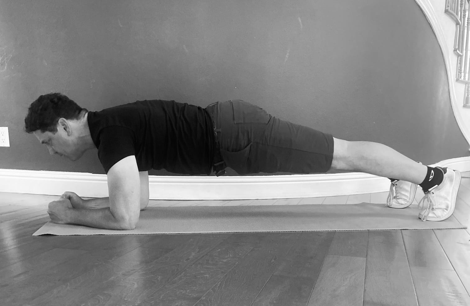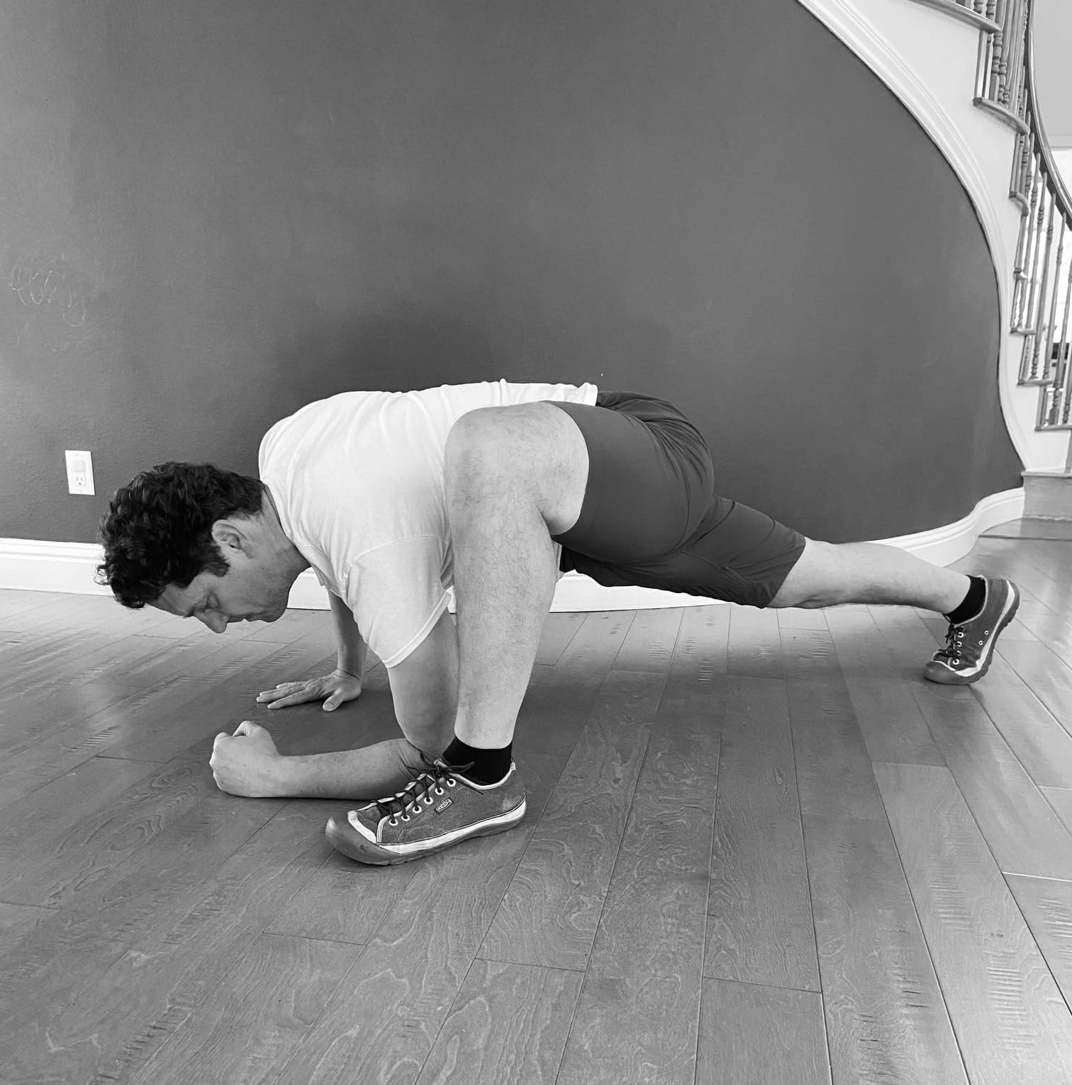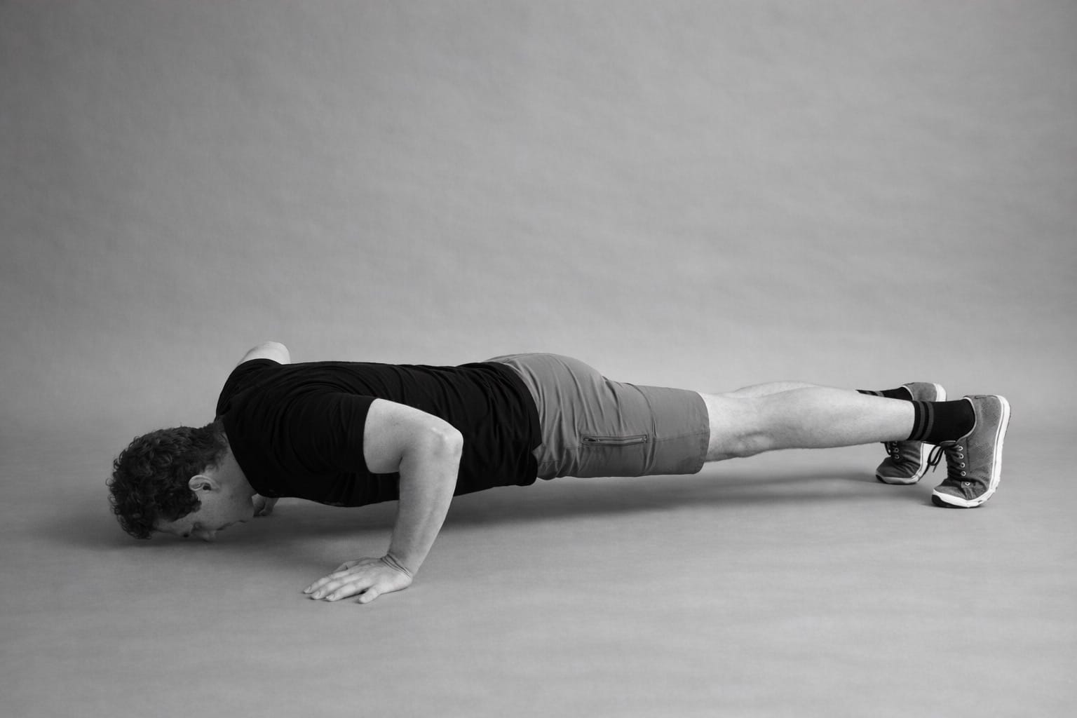 Important note: if you struggle to do a push-up, don't compromise by doing a "woman's push-up." (e.g. a push-up on your knees.) Exercises have no gender. Instead, opt to stay in the "neutral position" for twenty or thirty seconds, and progress from there. Or, try a plank on your elbows, which really targets the abs. (pictured below.)
