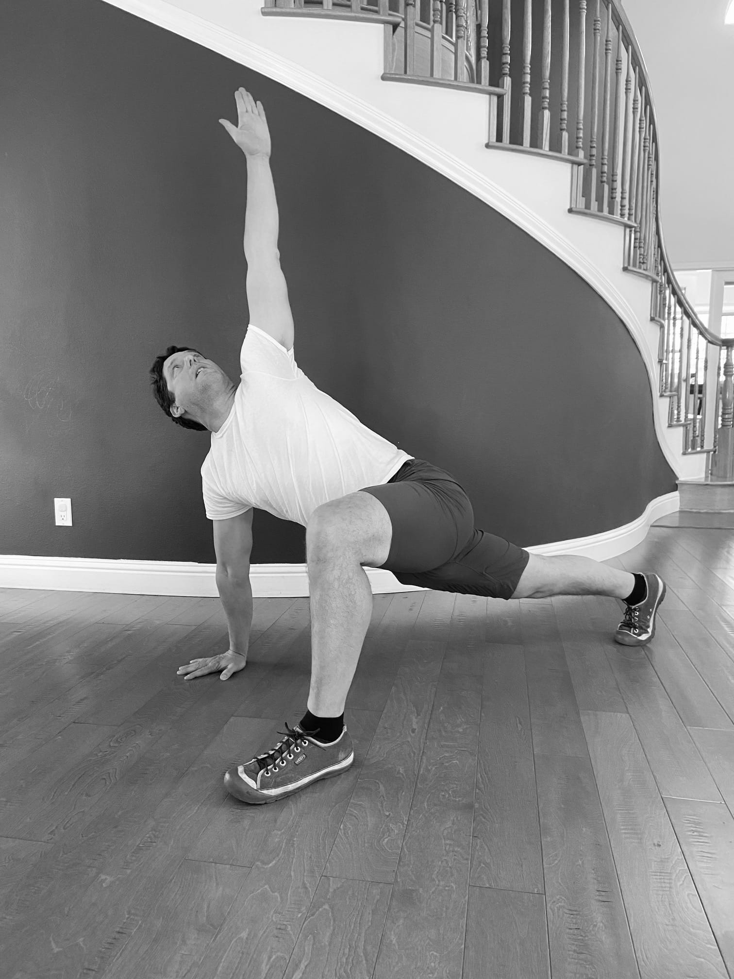 Note how my back (supporting) leg is straight. Only go as far down as your flexibility or discomfort level will allow while keeping the anchor leg straight. Hold for a five second count. This movement works muscle groups including the ab complex and the adductors (the groin muscles).