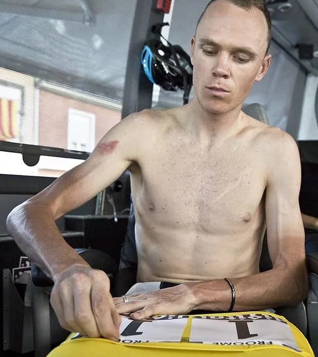 Is he fit? Well, his cardiovascular capabilities are certainly not in question. But he appears to have very little upper body muscle. Now, for all I know, Froome spends the off-season splitting wood and hauling timber. But, I kind of doubt that. Pro cyclists are notorious for wanting to cut weight at any cost; including unnecessary (read: upper body) muscle. So that leaves them equipped to cycle up hills at a very fast rate — and little else.