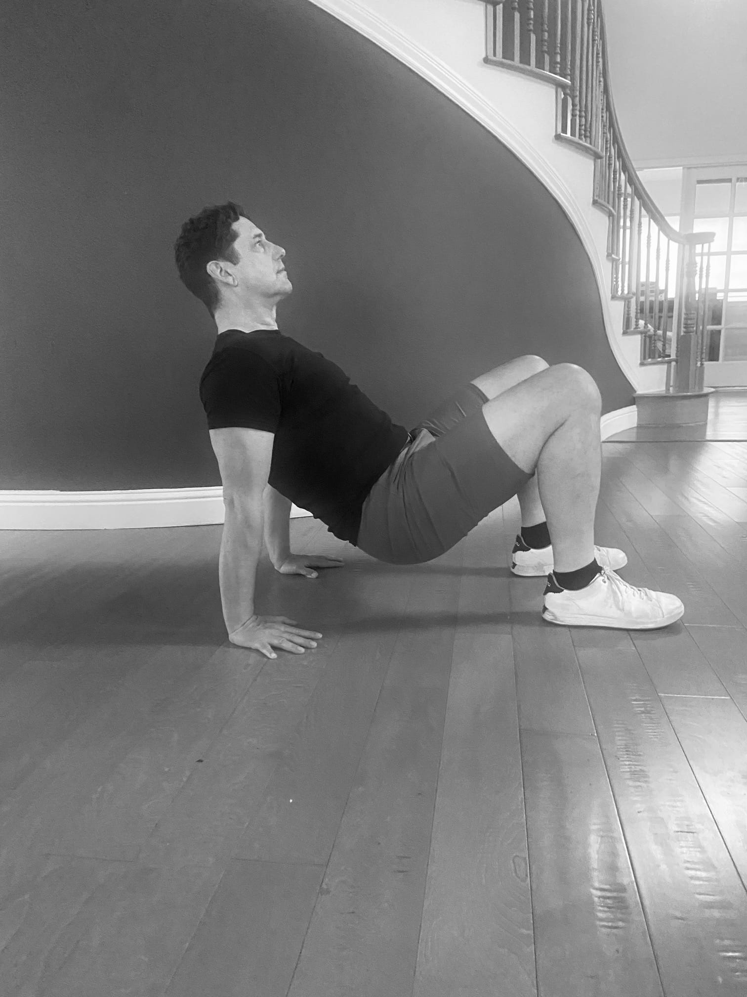 This is an updated version of an old classic. To do this exercise, sit on your butt with your knees bent and your hands positioned behind you. This is the starting position. Now, raise your butt of the ground. This is moving in the sagittal plane, and it targets the glutes, hamstrings, triceps and shoulders in particular. It looks like this: