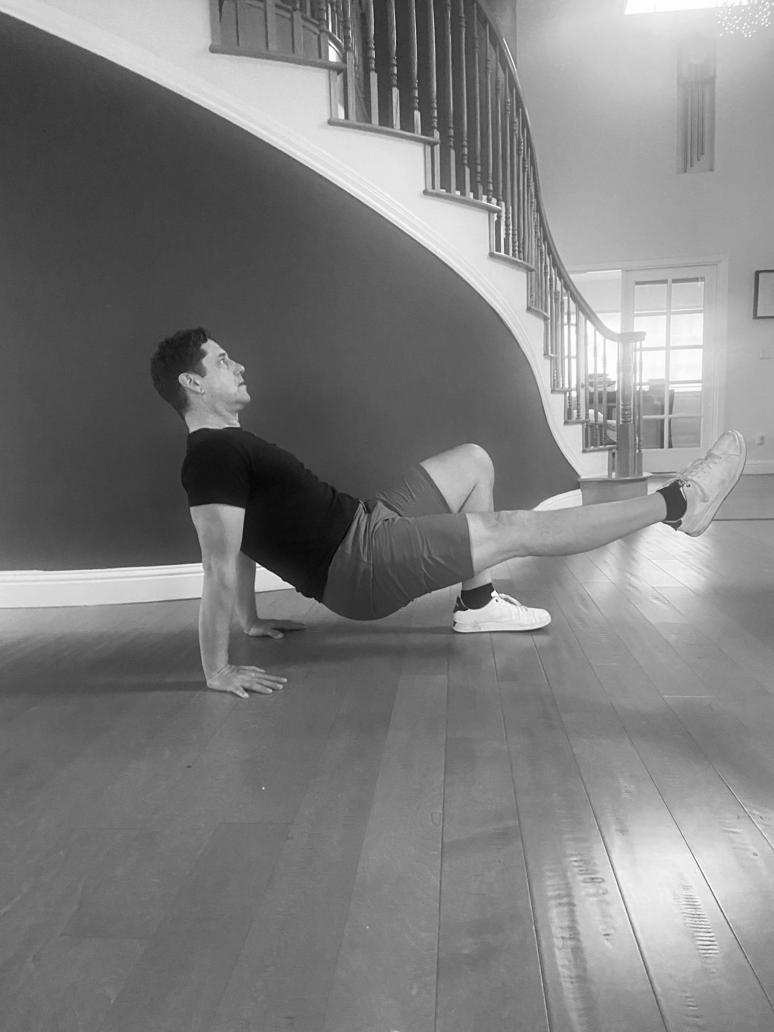 Now, while in that pose, take out leg straight out in front of you. This activates your quads. This is another movement in the sagittal plane. Like this: