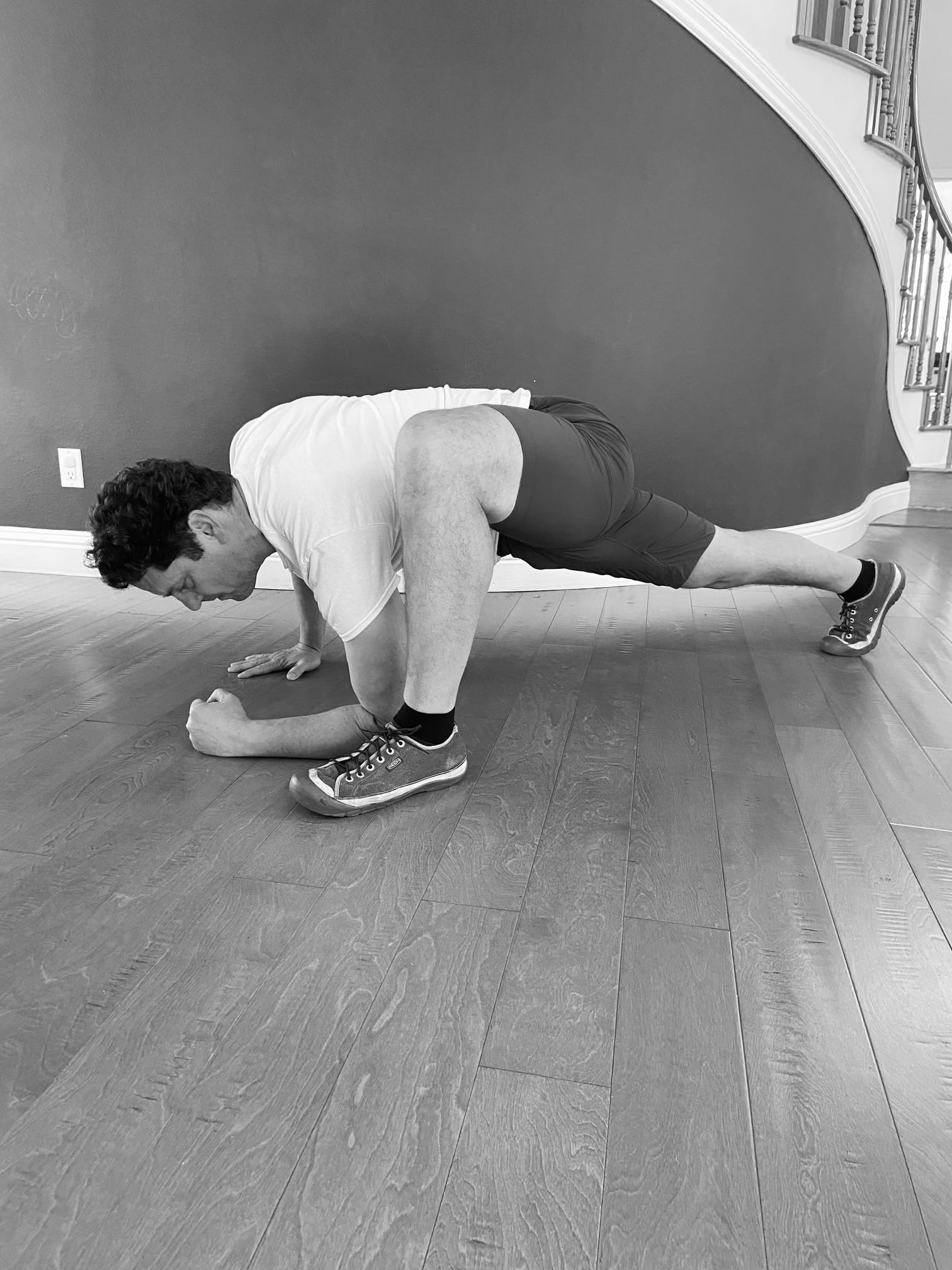 To do this movement, start in a push-up position, and then extend one leg forward with your knee bent. Lower your elbow to the inside of that knee and hold for a five count. This is movement in the sagittal plane. It's great for activating your adductors and hip flexors. It looks like this: