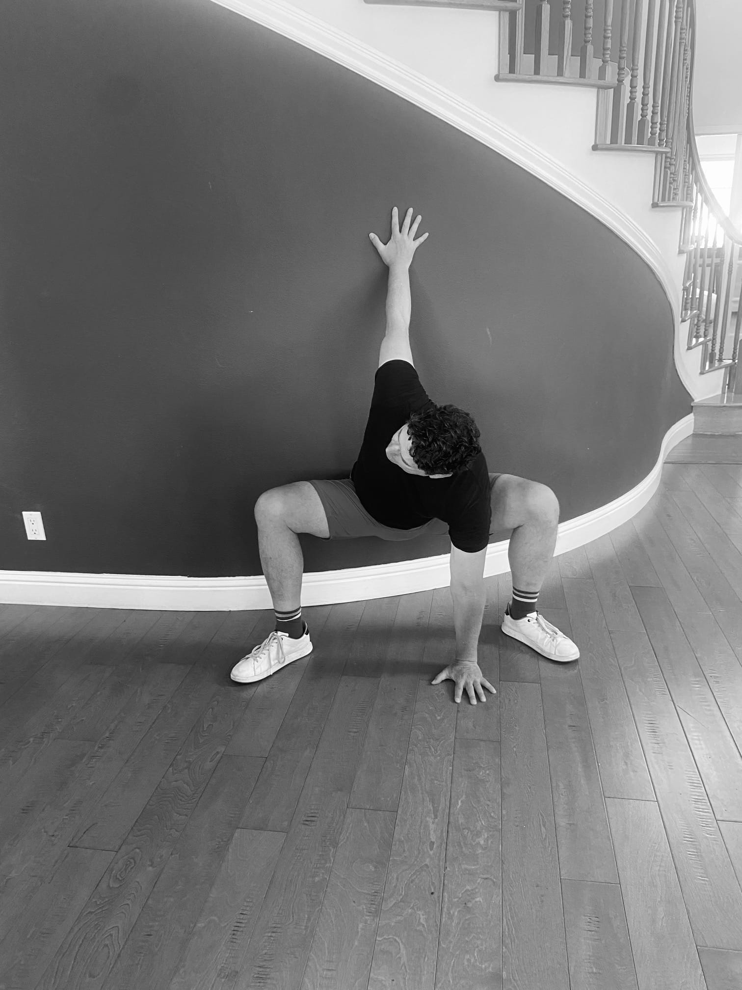 To do this movement, you'll want to position your back against a wall, and go into a squat with both palms flat on the ground. (This ensure a deep squat and really engages the adductor muscles.) While keeping one palm flat on the ground, reach around with the other arm and tap the wall behind you. This is moving in the transverse plane and focuses intently on your shoulder mobility. Try for two taps on each side, and then rise fully up and repeat. Squatting is a great exercise (the best body weight exercise along with the push-up) and is a prime example of movement in the sagittal plane. Try for a set of 20. It's demonstrated below.
